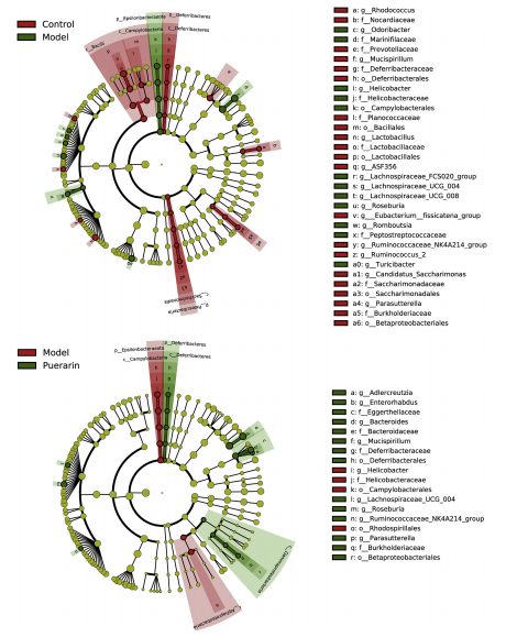 門水平的分類分析表明,厚壁菌門、擬桿菌門和放線菌門在所有類群的糞便微生物群落中占優(yōu)勢。與對照組相比,模型組的Epsilonbacteraeota水平較高,而葛根素處理可逆轉(zhuǎn)這一趨勢(圖7D)。采用LEfSe方法,篩選出LDA評分大于2.0的明顯改變的類群,以鑒定類群間(門到屬)的差異類群。如圖8和圖9所示,在對照組和模型組之間,模型和葛根素組之間,共發(fā)現(xiàn)了40和24個不同的細(xì)菌分類分支。有趣的是,在葛根素治療后,14種不同的細(xì)菌類群在NASH小鼠中顯示出相同的恢復(fù)正常水平的趨勢,包括p Epsilonbacteraeota, c Campylobacteria、o彎曲菌目、 f 螺桿菌科、 g幽門螺桿菌屬、p 脫鐵桿菌門、c 脫鐵桿菌、 o 脫鐵桿菌、 f 脫鐵桿菌科、g Mucispirillum、o Betaproteobacteriales、f burkholderaceae、g Parasutterella 和g瘤胃球菌科NK4A214組。值得一提的是,模型小鼠中氏菌屬的成員比對照組小鼠大,葛根素治療后進一步擴大。(字母 p、c、o、f 和 g 分別代表門、綱、目、科和屬)