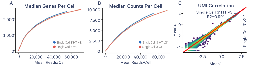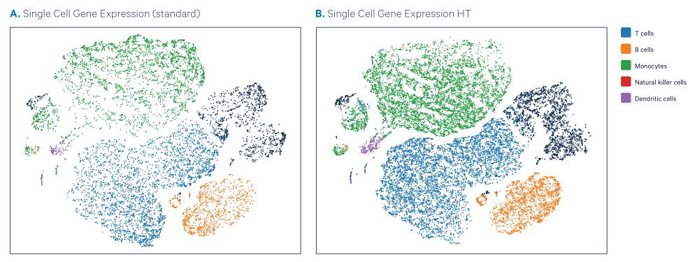 單細胞基因表達HT產(chǎn)生的數(shù)據(jù)可與標(biāo)準(zhǔn)分析的數(shù)據(jù)相比較,在每個細胞成本降低的情況下,細胞數(shù)量增加了一倍,更利于鑒定更多的細胞表型和分子調(diào)控機制。