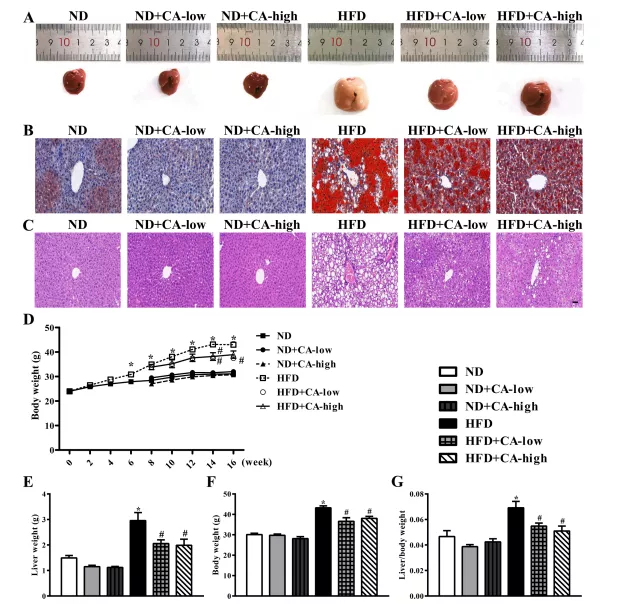 ND組小鼠隨機分為3組(n = 10),飼喂特定飼料,為期8周。這些組包括:1)喂食正常食物的ND小鼠;2)低ND+CA,喂食CA含量為0.08%的正常鼠糧;3)高ND+CA,喂食CA含量為0.16%的正常飼料。同時,高脂飲食組按以下飼