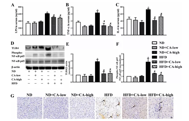 有報道稱,NAFLD的特征是腸道菌群改變、炎癥和腸道屏障破壞。肝組織炎癥被認(rèn)為是肝脂肪變性發(fā)展的驅(qū)動因素,腸道源性脂多糖被認(rèn)為在肝臟炎癥中具有致病作用。最近的動物實驗研究關(guān)注了腸道菌群LPS在NAFLD發(fā)生中的作用。腸道源性LPS是革蘭氏陰性菌外膜的主要成分,通過TLR4信號通路和下游炎癥級聯(lián)反應(yīng)促進(jìn)炎癥反應(yīng)。有報道稱,在NAFLD模型中,與野生型小鼠相比,tlr4缺陷小鼠的肝損傷、炎癥和脂質(zhì)積累減少。此外,阻斷腸道菌群與宿主細(xì)胞之間的脂多糖- tlr4相互作用可以阻止高脂喂養(yǎng)小鼠NAFLD的啟動和發(fā)展,這證實了脂多糖- tlr4通路在誘導(dǎo)NAFLD中具有非常重要的作用。與之前的研究結(jié)果一致,我們的研究表明,16周高脂飲食導(dǎo)致血清LPS和肝臟TLR4表達(dá)顯著增加,肝組織中磷酸化的NF-kB p65被激活,表明炎癥開始。同時,高脂喂養(yǎng)小鼠血清TNF-a、IL-6水平升高,肝臟mpo陽性細(xì)胞浸潤。所有劑量的CA補充均顯著扭轉(zhuǎn)了上述現(xiàn)象;在添加ca的ND組中沒有觀察到顯著差異(圖4A-G)。