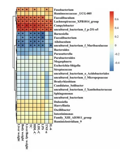 CA對hfd誘導(dǎo)小鼠腸道菌群組成、體增重、內(nèi)臟肥胖、血脂水平、炎癥等有保護(hù)作用。我們進(jìn)一步采用Spearman秩相關(guān)法對上述過濾后的糞便細(xì)菌與NAFLD相關(guān)參數(shù)進(jìn)行相關(guān)性分析。我們觀察到肝臟重量、體重、肝臟/體重、血清TC、HDL-C、LDL-C、LPS、TNF-a和IL- 6水平與Allobacul^n、Barne- siella、Faecalibacterium和uncultured_bact:erium_f_Muribaculaceae的相對豐度(屬水平)呈顯著負(fù)相關(guān)。此外,相對豐度(在屬級)的彎曲桿菌,Faecalibaculum,梭菌屬,Lachnospiraceae_XPB1014_group和uncultured_bacterium__p – 251 o5呈正相關(guān),與上面的非酒精性脂肪肝相關(guān)參數(shù),其中彎曲桿菌,Lach nospiraceae_XPB1014_group和uncultured_bacterium__p – 251 o5顯示最重要的正相關(guān)與非酒精性脂肪肝相關(guān)參數(shù)(圖6)。與這一結(jié)果一致,Allobaculum, Barnesiella,與ND組相比,高脂喂養(yǎng)小鼠的糞桿菌和未培養(yǎng)的細(xì)菌^Muribaculaceae減少。同時,HFD組Campylobacter、Faecalibaculum、Fusobacterium、Lachno- spiraceae_XPB1014_group和uncultured_bact:erium_f_p-251-o5的相對豐度增加,CA處理顯著降低了上述腸道菌群的相對豐度。