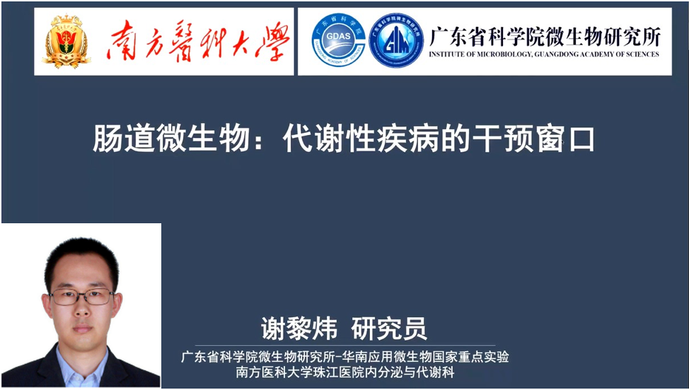 廣東省微生物研究所謝黎煒研究員講解了“腸道微生物:代謝性疾病的干預(yù)窗口”謝老師首先介紹了腸道菌群是多因素誘發(fā)肥胖癥的承載體,代謝性疾病,例如:2型糖尿病,肥胖和代謝性肝病等,嚴(yán)重?fù)p害身體健康,甚至致殘致死。研究發(fā)現(xiàn)代謝性疾病的發(fā)生和發(fā)展伴隨腸道微生物多樣性、種類和功能的變化,謝老師團隊近期開展的短期理床低碳減重研究和益生菌代謝產(chǎn)物緩解機體糖脂代謝的研究為代謝性疾病的腸道干預(yù)提供了有力的證據(jù)。