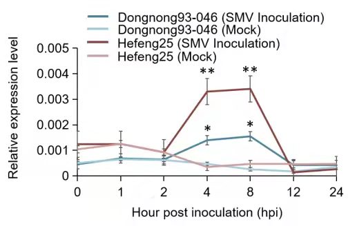 圖4 SMV抗性Dongnong93-046和對(duì)SMV性Hefeng25中的GmST1基因表達(dá)分析