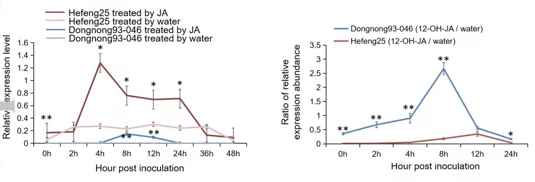 通過(guò)qRT-PCR和RNA-seq對(duì)SMV抗性株系 Dongnong93-046和SMV-感性株系Hefeng25的不同組織進(jìn)行分析,分析結(jié)果表明,GmST1基因受SMV感染調(diào)控,且該基因在抗SMV和易感SMV大豆品種之間存在差異表達(dá)(圖2)。由抗性基因介導(dǎo)的乙烯,水楊酸(SA)和茉莉酸(JA)等防御反應(yīng)相關(guān)激素在不同植株中存在差異,研究結(jié)果發(fā)現(xiàn):GmST1基因編碼SOT,12-OH-JA在茉莉酸代謝途徑中起作用,是SOT的直接底物。進(jìn)一步研究表明GmST1基因可能參與了JA代謝途徑,因此,RSVG2-R等位基因?qū)MV G2菌株的抗性可能取決于茉莉酸代謝途徑。