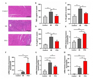 差異基因主要富集在炎癥反應(yīng)信號通路中,通過HE染色顯示MI組炎性細胞大量積聚,針刺可明顯減少炎性細胞浸潤。檢測血清中炎性細胞因子的水平顯示MI組血清TNF-α(腫瘤壞死因子-α)、IL-1β(白細胞介素-1β)、IL-6(白細胞介素-6)水平較對照組升高,針刺可降低這些炎性細胞因子水平,并通過PCR進行了驗證。