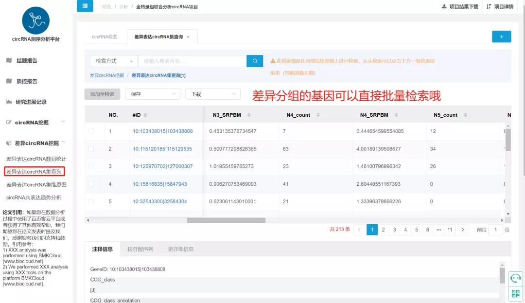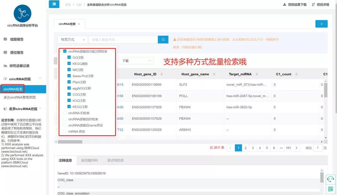 CircRNA的功能分析主要依靠于來源基因的功能注釋,如何在海量的數(shù)據(jù)中直接找到關(guān)心的目的基因呢?首先就是根據(jù)功能注釋進行檢索,百邁客云平臺的CircRNA分析平臺中,支持針對結(jié)果根據(jù)八大功能數(shù)據(jù)庫的注釋信息批量檢索相關(guān)注釋基因、并且批量提取相關(guān)信息;靶向關(guān)系的預(yù)測也是關(guān)鍵circRNA檢索的必要一步,CircRNA分析平臺同時支持通過miRNA的ID批量提取相關(guān)靶向的CircRNA信息,此外,CircRNA ID、來源基因ID、來源基因name等功能,通過上傳ID文件均可實現(xiàn)批量查詢,甚至可以批量下載序列文件,省去多個文件來回切換的繁雜操作,一鍵式提取關(guān)鍵信息!