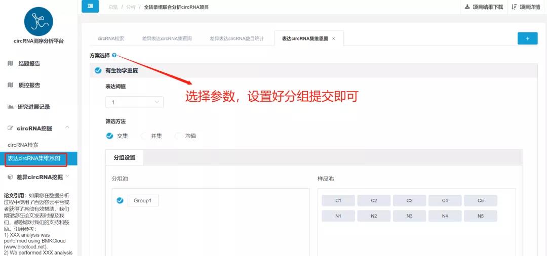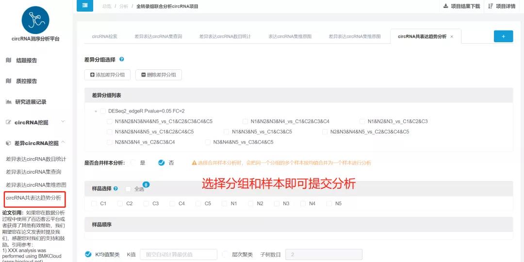 共表達分析常用于識別差異表達基因的共表達模式,分析各樣品間CircRNA表達豐度的不同變化模式,將相同表達趨勢的CircRNA劃分為一個數(shù)據(jù)集,通常我們認為,具有相同表達變化趨勢的基因的功能互有關(guān)聯(lián),所以通過分析CircRNA的共表達趨勢分析,可以進一步篩選出項目中關(guān)鍵的基因集合。CircRNA分析平臺搭載了共表達分析個性化,簡單的選擇基因集合以及樣本即可完成分析。