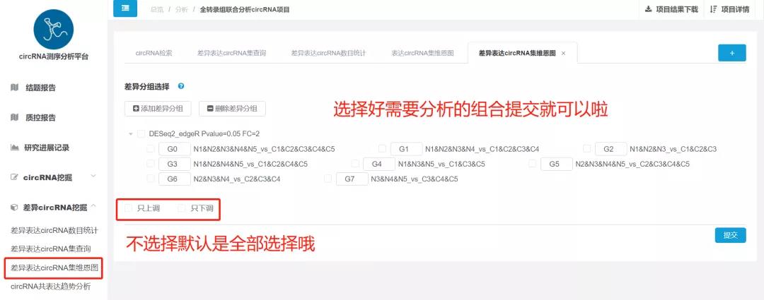 對于需要通過結(jié)果分析挑選關(guān)鍵基因的研究方向來說,選擇合適的差異篩選條件對于基因的選擇是事半功倍的,但是往往合適的篩選條件需要多次的調(diào)整摸索,這時差異篩選條件的調(diào)整功能顯得尤為重要,CircRNA云平臺同樣支持在線完成差異參數(shù)的調(diào)整,基因數(shù)目太少、差異軟件不合適、參數(shù)設(shè)置不合理等問題,通通可以調(diào)整!不限次、不限時,只需簡單的點擊,輕松完成!