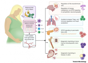 圖1.短鏈脂肪酸(SCFA)對(duì)腸道以外的器官和組織的影響,包括發(fā)育中的胎兒。富含不可消化纖維的飲食可促進(jìn)微生物發(fā)酵和結(jié)腸中SCFA的產(chǎn)生,從而通過(guò)直接作用于腸道上皮細(xì)胞和免疫細(xì)胞來(lái)促進(jìn)粘膜動(dòng)態(tài)平衡。[2]