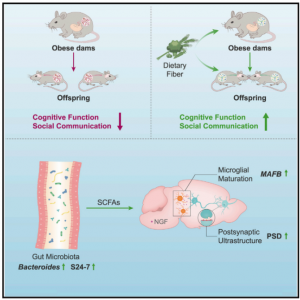 親肥胖與兒童認(rèn)知和社交能力低下密切相關(guān)。此外,已經(jīng)證明,母親肥胖會(huì)破壞后代的行為和腸道微生物群,母鼠或后代的高纖維飲食通過(guò)減輕突觸損傷和小膠質(zhì)細(xì)胞成熟缺陷恢復(fù)了這兩種行為和腸道微生物群。共同居住和糞便微生物群移植實(shí)驗(yàn)揭示了微生物群與行為變化之間的因果關(guān)系。此外,用微生物群衍生的短鏈脂肪酸治療也減輕了肥胖母鼠后代的行為缺陷。總之,研究表明,微生物群代謝物腦軸可能是母親肥胖引起的認(rèn)知和社會(huì)功能障礙的基礎(chǔ),高膳食纖維攝入可能是一種有希望的干預(yù)措施。