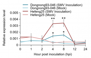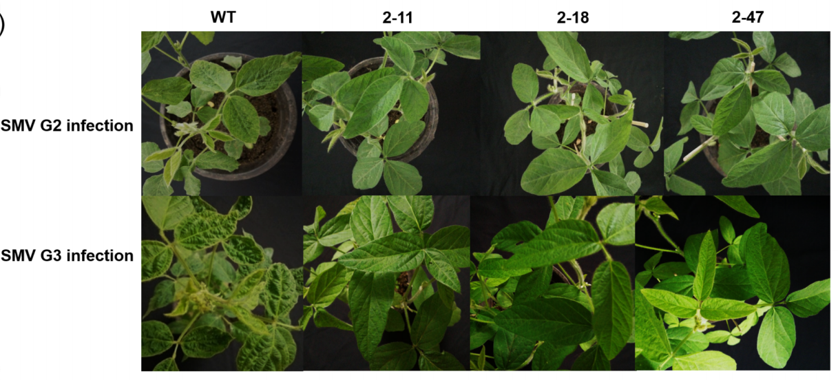 作者進(jìn)一步通過(guò)表達(dá)分析、遺傳轉(zhuǎn)化分析等方法驗(yàn)證GmST1基因?qū)Υ蠖够ㄈ~病毒的抗性,通過(guò)qRT-PCR和RNA-seq對(duì)SMV抗性株系Dongnong93-046和SMV-感性株系Hefeng25的不同組織進(jìn)行分析,分析結(jié)果表明,GmST1基因受SMV感染調(diào)控,且該基因在抗SMV和易感SMV大豆品種之間存在差異表達(dá)。通過(guò)轉(zhuǎn)基因過(guò)表達(dá)遺傳轉(zhuǎn)化實(shí)驗(yàn)發(fā)現(xiàn),GmST1的RSVG2-R等位基因提升了大豆對(duì)SMV G2和G3菌株的抗性。最終發(fā)現(xiàn)編碼磺基轉(zhuǎn)移酶的GmST1基因, 賦予大豆對(duì)大豆花葉病毒G2和G3株的抗性。