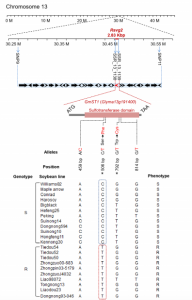 接著,作者又利用一個(gè)超大F2分離群體,在Rsvg2的間區(qū)和側(cè)翼區(qū),利用55個(gè)具有多態(tài)性的SSR標(biāo)記與F2中抗性植株的表型數(shù)據(jù)進(jìn)行關(guān)聯(lián)分析,將Rsvg2定位至2.83 kb區(qū)間內(nèi),該區(qū)間包含一個(gè)編碼SOT(磺基轉(zhuǎn)移酶)的GmST1基因。作者將GmST1確定為Rsvg2位點(diǎn)的候選基因。