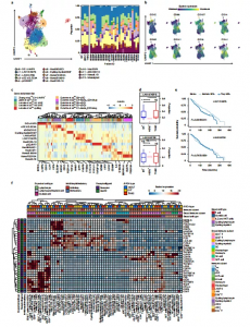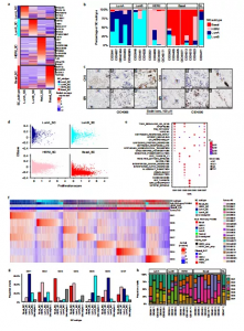 作者又在患者中發(fā)現(xiàn)了18個(gè)T細(xì)胞和先天淋巴細(xì)胞簇(圖3a)。在這5個(gè)CD8集群中,由3個(gè)高表達(dá)抑制性檢查點(diǎn)分子包括 LAG3、PDCDI 和 TIGIT和2個(gè)低表達(dá) IFNG 和 TNF的CD8 + T細(xì)胞組成。另外還發(fā)現(xiàn)了由1型干擾素(IFN-I)信號(hào)和增殖驅(qū)動(dòng)的兩個(gè)簇,它們都由CD4+和CD8+ T細(xì)胞組成。通過(guò)αβ T細(xì)胞受體和NK標(biāo)記的表達(dá),作者還鑒定了自然殺傷細(xì)胞(NK)和自然殺傷T (NKT)樣細(xì)胞。