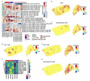 雖然一些研究表明間充質(zhì)細(xì)胞在調(diào)節(jié)抗腫瘤免疫中發(fā)揮重要作用,但基質(zhì)細(xì)胞和免疫細(xì)胞之間的相互作用尚未在組織中被闡明。作者在6例病患中發(fā)現(xiàn)5例肌成纖維細(xì)胞樣CAFs和iCAFs 之間存在中度負(fù)相關(guān)性(圖7a-c)。CAF定位在7個(gè)HER2+乳腺腫瘤的獨(dú)立空間轉(zhuǎn)錄組數(shù)據(jù)是一致的,表明這種關(guān)系在不同的臨床亞型中是保守的(圖7a)。與上述iCAFs的免疫調(diào)節(jié)特性一致的是,在兩項(xiàng)研究中,iCAFs均與多個(gè)淋巴細(xì)胞群體共定位(圖7a,d,c)。在6個(gè)樣本中,肌成纖維細(xì)胞樣CAFs與CD8+T細(xì)胞相關(guān)(圖7a),揭示與高TIL浸潤(rùn)或免疫炎癥表型的浸潤(rùn)性乳腺癌的功能相關(guān)。通過(guò)整合信號(hào)預(yù)測(cè)和細(xì)胞鄰近性,這些數(shù)據(jù)突出了 CAFs直接調(diào)控免疫細(xì)胞的相關(guān)候選因子。