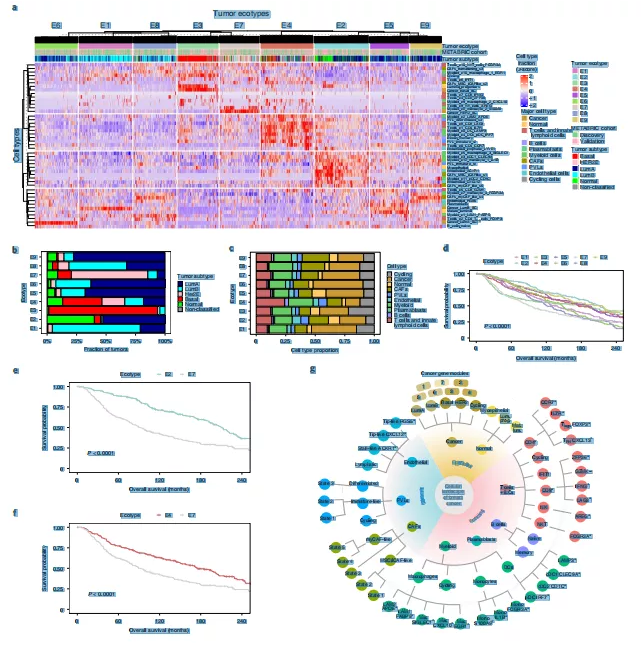 作者在26個(gè)腫瘤中觀察到顯著的變異和細(xì)胞頻率的重復(fù)模式,并從單細(xì)胞數(shù)據(jù)集中估計(jì)細(xì)胞組分,發(fā)現(xiàn)捕獲的細(xì)胞組分和預(yù)測(cè)的比例之間具有良好的整體相關(guān)性,大多數(shù)細(xì)胞類型出先顯著相關(guān)性。作者還觀察到在匹配bulk-PAM50分類的腫瘤中,聚類顯示9個(gè)細(xì)胞組成相似的腫瘤簇(“生態(tài)型”)(圖8a-c)。這些生態(tài)型與腫瘤亞型、sc亞型細(xì)胞和主要細(xì)胞類型的多樣性相關(guān)(圖8a)。Ecotype 3(E3)在含有Basal_SC等細(xì)胞和基底樣PAM50亞型的腫瘤中富集(圖8a,b)。El、E5、E6、E8和E9主要由管腔細(xì)胞組成。E4對(duì)與抗腫瘤免疫相關(guān)的免疫細(xì)胞高度富集(圖8a)。E2 主要由 LumA 和正常樣腫瘤組成(圖8a,b)。