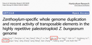 主要內(nèi)容:本研究基于PacBio測(cè)序平臺(tái),組裝了4.23 Gb花椒(鳳椒)基因組,并基于Hi-C技術(shù)將98%序列掛載至68條染色體上。比較基因組分析研究了揭示花椒在2,600萬年前經(jīng)歷了一次獨(dú)立的全基因組復(fù)制事件(η-WGD),以及在640萬年前發(fā)生了轉(zhuǎn)座子爆發(fā)事件,這系列事件造成了花椒大量基因組擴(kuò)增。作者進(jìn)一步結(jié)合轉(zhuǎn)錄組和代謝組分析表明,顯著的物種特異性基因家族擴(kuò)張和基因表達(dá)的變化影響了花椒麻味物質(zhì)、單萜類物質(zhì)和花青素的生物合成,并繪制了花椒麻味物質(zhì)合成的代謝通路圖。該參考基因組為研究近期轉(zhuǎn)座子擴(kuò)增和全基因組復(fù)制事件對(duì)基因得失和基因組重建的影響提供了有價(jià)值的模型,并為加速花椒遺傳改良提供了理論基礎(chǔ)。
