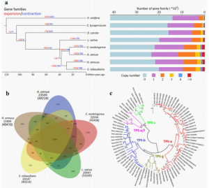 物種演化過程中,往往伴隨著基因家族的擴(kuò)張與收縮,基因家族(gene family)是來源于同一個(gè)祖先,由一個(gè)基因通過基因重復(fù)而產(chǎn)生兩個(gè)或更多的拷貝而構(gòu)成的一組基因,它們?cè)诮Y(jié)構(gòu)和功能上具有明顯的相似性,編碼相似的蛋白質(zhì)產(chǎn)物。而特定基因家族的擴(kuò)張可能在促進(jìn)植物表型多樣化和新性狀進(jìn)化中發(fā)揮重要作用。通過與具有相似/相反生物學(xué)功能的近緣物種比較,獲得相關(guān)基因家族,并將選擇其中某種擴(kuò)張基因家族聯(lián)合轉(zhuǎn)錄組差異表達(dá)以及代謝組,可以深度挖掘目的物種重要性狀形成機(jī)制與重要代謝通路。該研究方法是中藥、花卉、蔬果等植物研究中的重要環(huán)節(jié)。