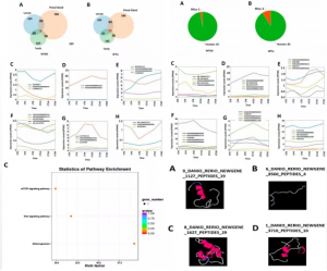 在本研究中,作者生成了斑馬魚幼魚的時間表達轉(zhuǎn)錄本圖譜,揭示了調(diào)控斑馬魚幼魚lncRNAs表達譜的晝夜動態(tài)。本研究發(fā)現(xiàn)了3220個lncRNAs在DD和LL條件下的表達譜,鑒定了578個周期表達的lncRNAs,并使用GO、COG和KEGG途徑富集分析對其進行注釋,結(jié)果表明,大多數(shù)這些節(jié)律表達的幼魚lncRNAs可能參與了關(guān)鍵的生物學(xué)過程。通過比較來自松果體和精巢的lncRNAs,發(fā)現(xiàn)9個(DD)和12個(LL)幼魚lncRNAs分別在斑馬魚松果體和精巢中共同表達,在這些共表達的lncRNAs編碼的多肽中,發(fā)現(xiàn)3個多肽(DD)和1個多肽(LL)具有蛋白質(zhì)數(shù)據(jù)庫中已知的結(jié)構(gòu)域。作者研究了這些共表達的lncRNAs編碼的多肽,以預(yù)測它們的3D模型和功能。此外,對人類、小鼠和果蠅的幼魚lncRNAs進行了保守分析,發(fā)現(xiàn)斑馬魚幼魚在DD和LL條件下分別與人類共享35和42個lncRNAs,與小鼠共享1個和4個lncRNAs。作者選擇了這三個物種共享的5種節(jié)律表達的lncRNAs進行編碼性研究,發(fā)現(xiàn)了這5種lncRNAs編碼的數(shù)百種多肽,對這些保守肽研究了它們的三維模型和相應(yīng)的已知結(jié)構(gòu)域,發(fā)現(xiàn)在α-螺旋、β-鏈和隨機卷曲方面具有相似性。這些結(jié)果將幫助晝夜節(jié)律生物學(xué)家選擇晝夜表達的lncRNA,以進行進一步的功能研究。