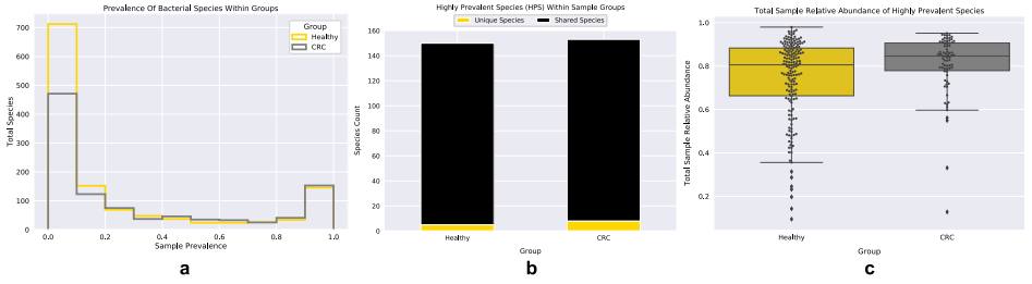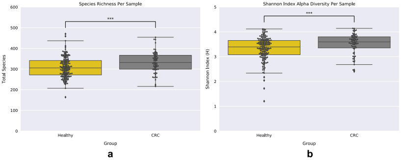 使用基于em的方法計算每個樣本內(nèi)物種的相對豐度,以構(gòu)建一個樣本分類單元矩陣,通過測量每個樣本的細菌豐富度和Shannon指數(shù),利用該矩陣探究兩個樣本組(健康和晚期CRC)的微生物多樣性。CRC組的樣本顯示出更大的多樣性,包括豐富度和Shannon指數(shù)(Mann-Whitney U檢驗:MWU);豐富度:MWU pvalue = 0.0005, Shannon指數(shù):MWU pvalue = 0.0009)(圖一a,b)。由于物種多樣性的量度對物種均勻度和豐富度的敏感性不同,還應(yīng)用了辛普森指數(shù)來計算樣本組內(nèi)的物種多樣性,這些結(jié)果與之前的分析一致,CRC樣本中的物種多樣性與健康樣本中的物種多樣性有顯著性差異(MWU值= 0.0238).