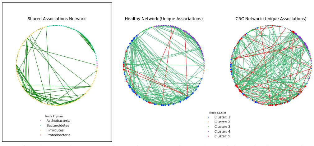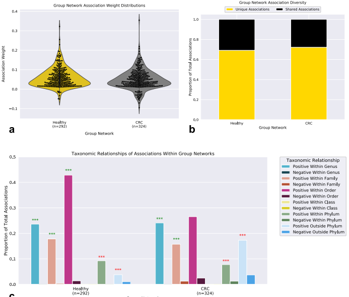 群體網(wǎng)絡(luò)包含相似的關(guān)聯(lián)權(quán)重分布,正相關(guān)比負相關(guān)更多(圖4a)。值得注意的是,與健康網(wǎng)絡(luò)相比,CRC包含更多的負相關(guān)。29%的負相關(guān)涉及一種被認為是口腔微生物的物種,而在健康網(wǎng)絡(luò)中,沒有發(fā)現(xiàn)涉及口腔菌群。在網(wǎng)絡(luò)中發(fā)現(xiàn)的大多數(shù)關(guān)聯(lián)是該網(wǎng)絡(luò)獨有的(健康:69%,CRC:72%)(圖4b)。我們假設(shè)群落結(jié)構(gòu)的這種巨大差異可以反映生態(tài)系統(tǒng)的變化,并進而分析了網(wǎng)絡(luò)中物種之間的分類關(guān)系(圖4c)。兩個網(wǎng)絡(luò)在同一屬內(nèi)的物種(健康:MCS pvalue= 0.00099,CRC:MCS pvalue= 0.00099)和家族(健康:MCS值= 0.00099,CRC:MCS= 0.00099 )。然而,只有在健康組的網(wǎng)絡(luò)中,物種與來自同一順序的其他物種的積極相關(guān)仍然明顯多于隨機相關(guān)(健康:MCS pvalue= 0.00099,CRC: MCS pvalue = 0.44)。與健康網(wǎng)絡(luò)(健康:4%,CRC:17%)相比,CRC的網(wǎng)絡(luò)在分類上的遠緣關(guān)系中顯示出更大的豐度,在健康網(wǎng)絡(luò)中分類上的遠緣微生物之間的正關(guān)聯(lián)仍然顯著較少(門內(nèi):MCS值= 0.00099,門外:MCSp值= 0.00099)和CRC(門內(nèi):MCS pvalue= 0.00099,門外:MCS pvalue= 0.00099)而不是隨機網(wǎng)絡(luò)。