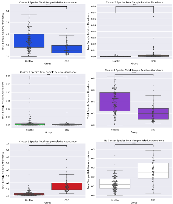 通過構(gòu)建CLR轉(zhuǎn)換的模塊功能來比較模塊的潛在功能。模塊功能(蛋白域)圖譜的PCA顯示出較大的差異(PC1: 33.73%,PC2: 14.53%),模塊似乎形成包含兩組代表的簇團(圖 5a)。為了定義模塊的聚類,進行了輪廓分析,估計五個聚類作為用于K-均值聚類的最*K值(圖?5b)。通過K-均值聚類定義模塊聚類后(圖?5c)對這些集群進行了分類分析。在整個網(wǎng)絡(luò)中,同一集群內(nèi)的模塊被發(fā)現(xiàn)在分類學(xué)上是相似的,不包括簇1和簇5,簇1和簇5顯示出物種占有的變化,其中在健康網(wǎng)絡(luò)的簇1內(nèi)發(fā)現(xiàn)的一些物種被顯示在CRC組的簇5內(nèi)。然而,兩個網(wǎng)絡(luò)對在簇2、3和4中發(fā)現(xiàn)的物種有很強的一致性。第2組中的物種僅有“致病菌”(即通常無害但在特定環(huán)境條件下具有致病能力的物種)口腔微生物,而簇3主要是鏈球菌種和簇4主要類桿菌種。隨后,進行聚類功能分析以發(fā)現(xiàn)蛋白質(zhì)結(jié)構(gòu)域,以及蛋白質(zhì)家族的主要作用和次要作用,這使得聚類在功能上不同。簇1的功能與細胞表面粘附、對抗沖突策略、酪氨酸重組酶、多糖降解、糖胺聚糖結(jié)合、腫瘤蛋白酶抑制、過氧化物酶功能、碳水化合物/纖維素結(jié)合活性和氨基酸生物合成相關(guān)。簇2的功能涉及對宿主細胞和細胞外基質(zhì)的粘附、細胞感染、膠原結(jié)合、補體抗性、鳥氨酸/賴氨酸/精氨酸脫羧酶(組織腐敗/多胺合成/酸性環(huán)境抗性)、金屬肽酶、V型分泌系統(tǒng)、氨的產(chǎn)生和有毒金屬離子的排泄(銅流出系統(tǒng))、細胞包膜、DNA代謝、脂肪酸和磷脂代謝、表面多糖和脂多糖的生物合成和降解。簇3的功能與粘蛋白結(jié)合、鋅清除/吸收、細胞表面粘附、葡萄糖結(jié)合/轉(zhuǎn)運和銅結(jié)合、蛋白質(zhì)和肽的命運/合成/分泌、多糖/碳水化合物、有機醇和酸的降解方面有關(guān)。簇4的功能涉及金屬結(jié)合、二瓜氨酸環(huán)化酶/磷酸二酯酶、群體感應(yīng)、碳水化合物結(jié)合和半胱氨酸/木瓜蛋白酶、核苷和核苷酸、轉(zhuǎn)運和結(jié)合蛋白、TCA循環(huán)、鐵攜帶以及表面多糖的降解和生物合成。最后簇5的區(qū)別功能與氨肽酶、三羧酸受體、乙醇胺轉(zhuǎn)運、淀粉利用、木葡聚糖/多糖結(jié)合、能量代謝、氨基酸和胺、陽離子和鐵化合物、電子轉(zhuǎn)運以及表面多糖和脂多糖的生物合成和降解相關(guān)。檢查了在每個集群內(nèi)發(fā)現(xiàn)的用于網(wǎng)絡(luò)構(gòu)建的物種的豐度(健康:簇1 (33%)、簇2 (2%)、簇3 (5%)、簇4 (26%)、簇5 (7%)、無(27%);CRC:簇1 (19%)、簇2 (3%)、簇3 (3%)、簇4 (12%)、簇5 (30%)、無(33%)(圖6)。我們的發(fā)現(xiàn)表明,與健康組相比,在CRC中,第2類和第5類組模塊中發(fā)現(xiàn)的物種總數(shù)增加,第1類、第3類和第4類組中發(fā)現(xiàn)的物種減少。這些結(jié)果也反映在我們發(fā)現(xiàn)的總樣本相對豐度的統(tǒng)計顯著變化中,即群內(nèi)物種在群間所占的比例(第一組: MWU值= 4.29 e-12;第二組:MWU值= 3.16 e-16;第三組:MWU值= 0.0002;第四組:MWU值= 2.62-13;第五組:MWUp值= 2.81 e-29;無集群物種:MWU值= 4.40-17(圖7)。此外,發(fā)現(xiàn)網(wǎng)絡(luò)內(nèi)的大多數(shù)負面關(guān)聯(lián)(健康:100%,CRC:96%)發(fā)生在占據(jù)不同集群類型內(nèi)模塊的物種之間。只有在CRC中,簇1的物種之間才出現(xiàn)集群內(nèi)的負相關(guān),其中物種種類和豐度也顯示出減少。