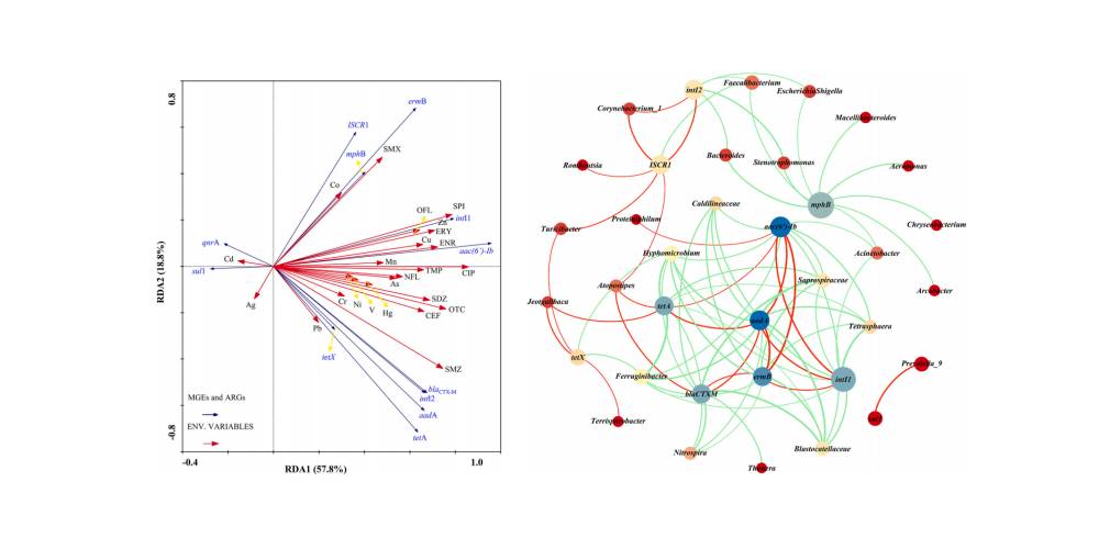 抗生素耐藥性是影響生態(tài)系統健康和公共衛(wèi)生的一個日益嚴重的問題。該研究在中國新鄉(xiāng)16個采樣點調查了9個耐藥基因(ARGs)和3個移動遺傳元件(MGEs)及其與抗生素、重金屬和微生物群的關系。醫(yī)院排出物中氟喹諾酮類(fluoroquinolones)含量最高,動物糞便中土霉素(oxytetracycline)含量最高。動物糞便中鋅和銅含量最高,可能影響intI1和aac(6’)-Ib基因的擴散。氨基糖苷類和磺胺類耐藥基因(aac(6 ‘)-Ib、aadA和sul1)是該地區(qū)主要ARGs。此外,除sul1基因外,動物糞便中ARGs和MGEs的檢出量均高于醫(yī)院污水。另一方面,污水處理廠(MWWTPs)中抗生素(29.76-100%)、重金屬(31.25-100%)和ARGs(1-3個數量級)的不完全去除導致這些污染物在下游河流中積累。網絡分析表明,ARG的潛在宿主(Jeotgalibaca、Atopostipes、Corynebacterium_1等)在動物糞便中比在醫(yī)院污水中更占優(yōu)勢,表明與醫(yī)院污水相比,ARG在動物糞便中的轉移潛力更高。這些結果為抗生素、重金屬、ARGs和微生物從人類和動物源通過MWWTP排放和施肥向接收環(huán)境的不同遷移和傳播途徑提供了有用的見解。