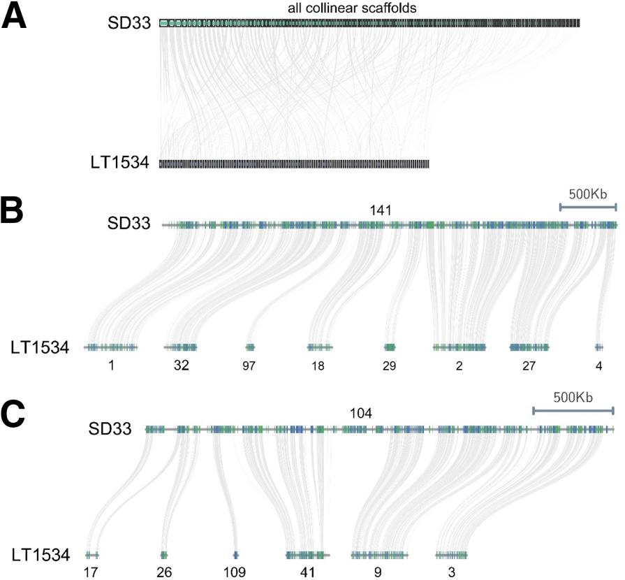 圖2.P. capsiciSD33和LT1534之間的基因組同線性