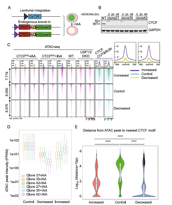 前期研究已經(jīng)通過(guò)將雙等位基因miniAID-mClover3標(biāo)簽導(dǎo)入人的內(nèi)源性CTCF位點(diǎn),并產(chǎn)生了三個(gè)CTCFAID細(xì)胞的克隆。在強(qiáng)力霉素和生長(zhǎng)素(IAA)處理下,強(qiáng)制表達(dá)與Skp1/Culin/F-box (SCF)泛素連接酶組分連接的OsTIR1,快速降解CTCF融合蛋白(圖1A)。當(dāng)強(qiáng)力霉素和IAA完全從培養(yǎng)基中洗脫后,這種降解是可逆的。通過(guò)對(duì)三個(gè)單細(xì)胞來(lái)源的克隆進(jìn)行IAA處理24小時(shí)的免疫印跡實(shí)驗(yàn),證實(shí)了CTCF能夠有效降解(圖1B),類似于之前在48h處理?xiàng)l件下的研究結(jié)果。