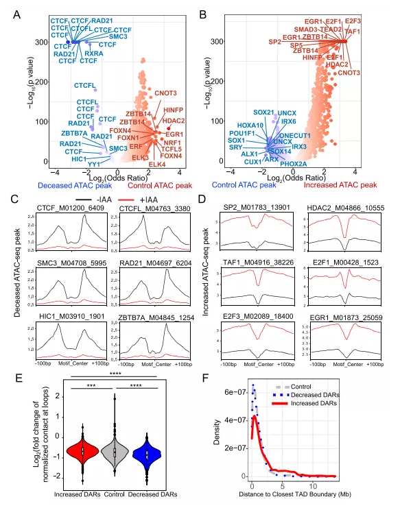 接下來(lái)分析這些DARs與它們最近的CTCF motif之間的物理距離。結(jié)果表明,可及性減弱的DARs更接近于最近的CTCF motifs。相比之下,可及性增強(qiáng)的DARs與CTCF motif的距離顯著高于可及性減弱的DARs,但顯著低于對(duì)照組(圖1E)。