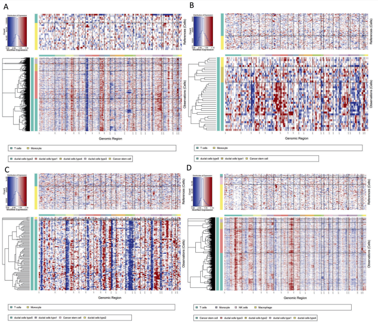 2021年發(fā)表在Cell Death Discovery(IF=5.241)上的《Single-cell RNA transcriptome reveals the intra-tumoral heterogeneity and regulators underlying tumor progression in metastatic pancreatic ductal adenocarcinoma》[3],基于每個(gè)樣本的inferCNV計(jì)算和識(shí)別大規(guī)模染色體拷貝數(shù)變異(CNV),得到CNV熱圖,結(jié)果發(fā)現(xiàn)與對(duì)照樣品相比,5種導(dǎo)管細(xì)胞亞型經(jīng)歷了顯著的CNV事件,其中1型導(dǎo)管細(xì)胞的CNV水平顯著高于其他類型的導(dǎo)管細(xì)胞。這些結(jié)果表明導(dǎo)管細(xì)胞的5種亞型都是轉(zhuǎn)移性病變中的惡性細(xì)胞。針對(duì)篩選到的惡性細(xì)胞,著重研究其轉(zhuǎn)錄異質(zhì)性,結(jié)果發(fā)現(xiàn),惡性導(dǎo)管細(xì)胞和癌癥干細(xì)胞具有不同的基因表達(dá)譜,癌癥干細(xì)胞上調(diào)表達(dá)干性特征基因,包括ALDH1A1、PROM1和NES,而導(dǎo)管譜系細(xì)胞cluster上調(diào)表達(dá)導(dǎo)管marker,如MMP7、TSPAN8和SOX9。