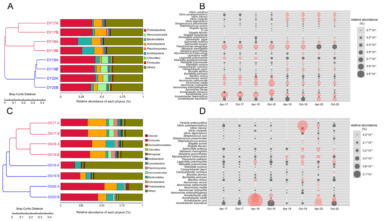 A:DY細(xì)菌群落相對(duì)豐度;B:DG中細(xì)菌群落相對(duì)豐度;C:DY樣品中細(xì)菌病原體的動(dòng)態(tài);D:DG樣品中細(xì)菌病原體的動(dòng)態(tài)