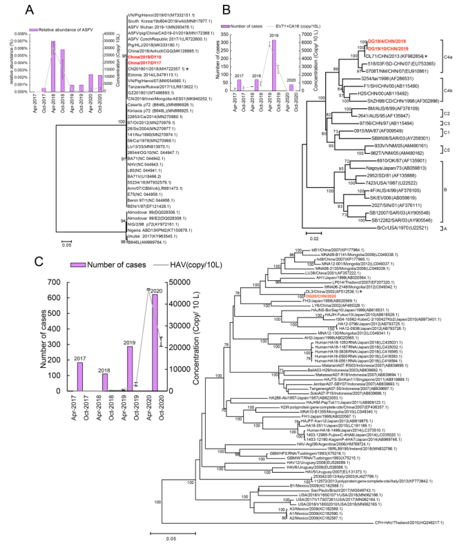 在DY發(fā)現(xiàn)了非洲豬瘟病毒(ASFV)和豬痘病毒(Swinpox Virus)等幾種病毒。ASFV在2017年10月被檢測(cè)到,并在2018年達(dá)到頂峰(圖6A),并通過qPCR證實(shí)。qPCR在2018年4月后連續(xù)檢測(cè)到ASFV,其中2018年4月的病毒載量為3.0×103拷貝/L。在DG地點(diǎn)未檢測(cè)到ASFV和Swinpox病毒,在兩個(gè)地點(diǎn)均未檢測(cè)到其它人畜共患病DNA病毒。通過高通量微流控芯片檢測(cè)檢測(cè)了40種致病性RNA病毒的存在。DY樣品中,經(jīng)qPCR確認(rèn),2019年僅檢測(cè)到諾如病毒、流行性腮腺炎病毒、鼻病毒和Human herpesvirus 6病毒。DG樣品中,2017年至2019年在樣本中檢測(cè)到human enterovirus 71 (EV71),2020年4月檢測(cè)到Coxsackievirus 16 (CA16)。