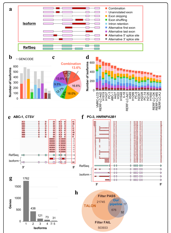 文章鑒定了轉(zhuǎn)錄異構(gòu)體的完整外顯子-內(nèi)含子結(jié)構(gòu),并將其分為以下類型:未標(biāo)記外顯子、外顯子跳躍、互斥外顯子、內(nèi)含子保留、5’可變外顯子和3’可變外顯子(圖 1a)。因此,文章從所有細(xì)胞系中鑒定出3474種非RefSeq亞型,并將它們命名為假定的“異常剪接亞型”,以下簡(jiǎn)稱為“亞型”,2021種亞型包含至少一個(gè)在參考序列或基因代碼數(shù)據(jù)集中沒(méi)有出現(xiàn)的剪接事件(圖1b)。還在單個(gè)全長(zhǎng)轉(zhuǎn)錄本上鑒定了這些剪接事件的新組合,這很難通過(guò)短reads測(cè)序數(shù)據(jù)的片段reads檢測(cè)到。