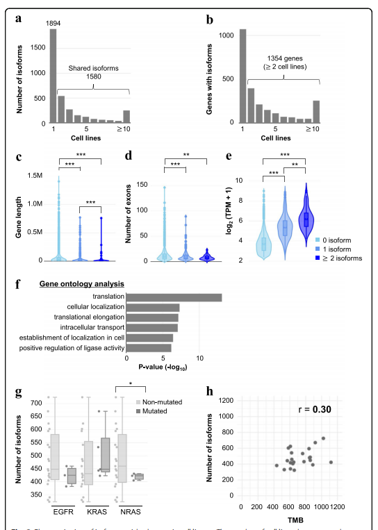 為了表明富含同種亞型的基因,作者比較了有或無(wú)的同種亞型基因長(zhǎng)度、外顯子數(shù)量和表達(dá)水平。與不含同種亞型的基因相比,含有至少一種同亞型的基因顯示出更短的序列長(zhǎng)度,并且由較少數(shù)量的外顯子組成;然而,發(fā)現(xiàn)含有同種亞型的基因的表達(dá)水平明顯升高。作者還發(fā)現(xiàn),同種亞型的多樣性與基因長(zhǎng)度和表達(dá)水平有關(guān)。具有一種同種亞型的細(xì)胞系的基因顯示了具有兩種或多種同種亞型在基因長(zhǎng)度和表達(dá)水平上的顯著差異。例如,在VMRC-LCD中,富含同種亞型的基因往往比只有一種同亞型的基因長(zhǎng)度更短,表達(dá)量更高(圖2c–e)。