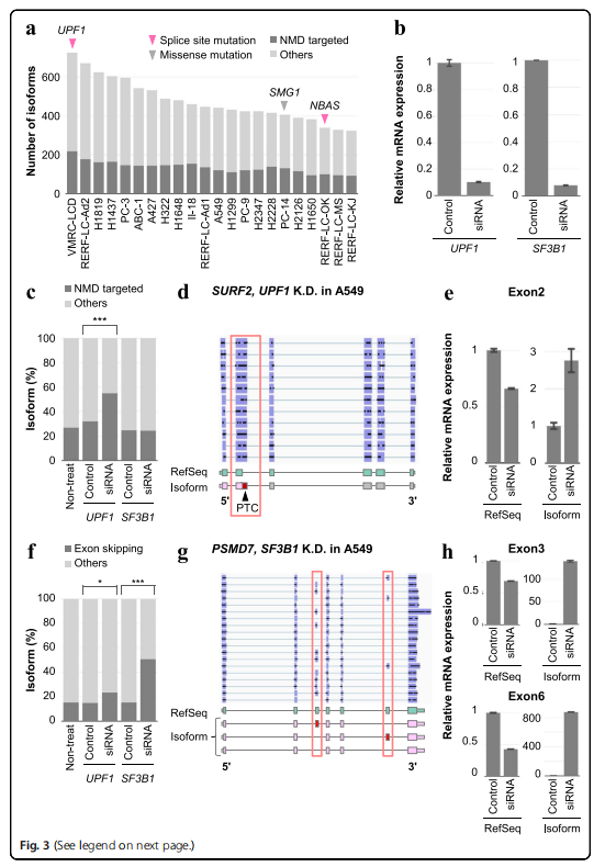 SF3B1是一種眾所周知的剪接因子,在多種疾病中發(fā)生突變,并導(dǎo)致異常剪接亞型的增加。作者通過(guò)SF3B1敲除評(píng)估剪接損傷的影響以及研究剪接因子的畸變是否影響轉(zhuǎn)錄本的產(chǎn)生。作者發(fā)現(xiàn)外顯子跳躍的比例顯著增加(圖3f),例如,PSMD7的外顯子3和6 在敲除后被改變(圖3g)。SF3B1-depleted的A549細(xì)胞中,外顯子跳躍亞型的表達(dá)PSMD7在中顯著增加,相反,RefSeq類型減少。為了確認(rèn)剪接位點(diǎn)近端區(qū)域的共有序列,作者收集了僅在SF3B1在A549細(xì)胞中敲除檢測(cè)到的外顯子跳躍異構(gòu)體。在這項(xiàng)分析中,作者用新的剪接連接的10 bp的區(qū)域,并跳過(guò)了外顯子。具有外顯子跳躍亞型的基因在翻譯和泛素-蛋白酶體途徑中顯示出顯著的富集,因此,這些因素的中斷可能會(huì)改變至少一些異常剪接亞型,并可能導(dǎo)致它們?cè)诜伟┘?xì)胞中的積累。