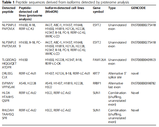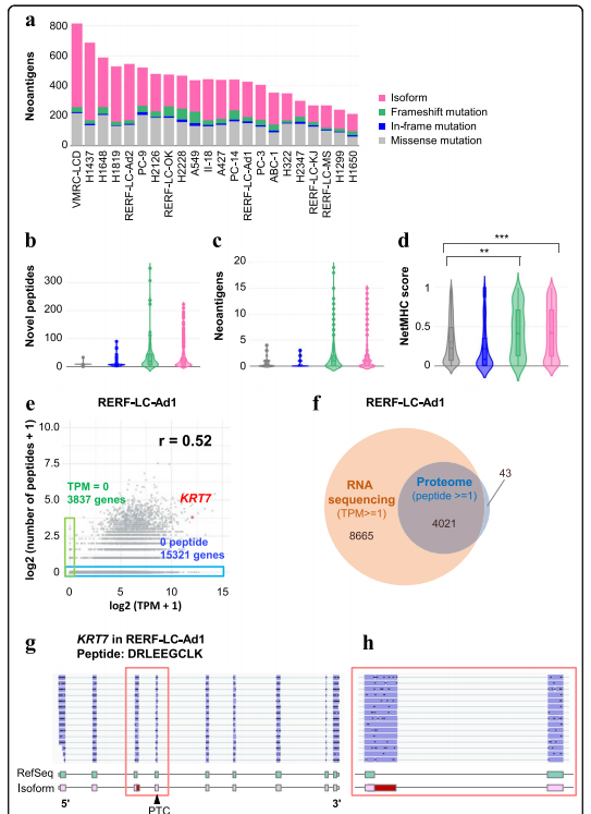 為了從實(shí)驗(yàn)上驗(yàn)證異常的轉(zhuǎn)錄本是否被翻譯成蛋白質(zhì),對(duì)11種細(xì)胞系(A427、A549、H1650、H2228、II-18、PC-9、RERF-LC-Ad1、RERF-LC-Ad2、RERF-LC-KJ、RERF-LC-MS和VMRC-LCD)采用了使用液相色譜結(jié)合串聯(lián)質(zhì)譜(LC/MS/MS)對(duì)于多肽識(shí)別,作者基于每個(gè)細(xì)胞系的MinION數(shù)據(jù)定制了肽序列數(shù)據(jù)庫(kù)。如前所述,普通轉(zhuǎn)錄組測(cè)序由于其測(cè)序能力,顯示出比LC/MS/MS蛋白質(zhì)組學(xué)更高的基因覆蓋率。通過(guò)液相色譜/質(zhì)譜/蛋白質(zhì)組學(xué)檢測(cè)的每個(gè)基因的肽數(shù)與通過(guò)轉(zhuǎn)錄組測(cè)序數(shù)據(jù)計(jì)算的TPM相關(guān)(r= 0.52,圖4e)而且LC/MS/MS蛋白質(zhì)組學(xué)檢測(cè)到的大部分基因也被轉(zhuǎn)錄組測(cè)序覆蓋(圖4f)。作者成功地檢測(cè)到7個(gè)翻譯自異常剪接亞型特異性區(qū)域的多肽。例如,衍生自外顯子3中具有選擇性5’剪接的轉(zhuǎn)錄本的多肽KRT7存在于RERF-LC-Ad1(圖4g)。在GENCODE數(shù)據(jù)庫(kù)中沒(méi)有發(fā)現(xiàn)這種轉(zhuǎn)錄本,但是在ENST00000547613中觀察到了這種同中型特異性連接,其被認(rèn)為是處理過(guò)的轉(zhuǎn)錄本。MinION也證實(shí)了在H1437、H2126和II-18中的表達(dá)(表1).此外,這種轉(zhuǎn)錄本有可能產(chǎn)生幾個(gè)新抗原,這些新抗原是由NetMHC預(yù)測(cè)的。這些結(jié)果表明,一些異常剪接亞型被真正翻譯成肽,并可能在癌癥中產(chǎn)生新抗原中發(fā)揮作用。