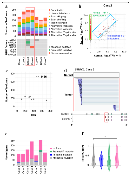 為了檢查體內(nèi)癌細(xì)胞中是否也存在異常剪接轉(zhuǎn)錄本,作者接下來(lái)分析了臨床肺癌標(biāo)本。應(yīng)用與臨床樣本細(xì)胞系分析相同的分析方案,能夠識(shí)別每個(gè)患者的異常剪接亞型(圖5a)。作者選擇了在腫瘤樣本中表達(dá)水平比非腫瘤樣本高至少兩倍的轉(zhuǎn)錄本(圖5b)在所有臨床樣本中鑒定出982種富含癌癥的剪接亞型。其中,448種亞型在參考序列或基因代碼。異常亞型的數(shù)量和TMB之間沒(méi)有顯著的相關(guān)性(圖5c)。作為檢測(cè)到的轉(zhuǎn)錄本的一個(gè)例子,在SMOC2如圖1所示5d和僅在病例3的腫瘤中表達(dá)。類似于細(xì)胞系分析的結(jié)果,作者可以識(shí)別獨(dú)立剪接事件的幾種獨(dú)特組合模式,這些模式占這些未標(biāo)記亞型的14.5%。還確定了保留在癌細(xì)胞中的潛在的NMD靶向亞型,這表明NMD機(jī)制在相應(yīng)的癌癥中被破壞。值得注意的是,在病例3和4中,發(fā)現(xiàn)*大數(shù)量的潛在NMD靶向亞型在關(guān)鍵NMD因子中存在移碼或無(wú)義突變,UPF3B和SMG8(圖5a)。