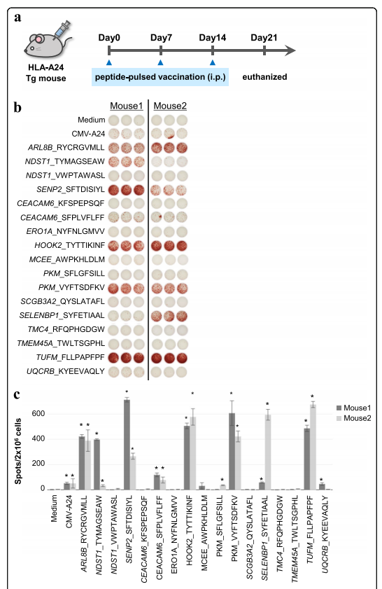 為了評(píng)估從異常剪接亞型和移碼突變中鑒定的肽的抗原性,作者根據(jù)圖6a所示的方案用候選肽免疫HLA-A24轉(zhuǎn)基因小鼠。作者根據(jù)人類白細(xì)胞抗原-α:24:02的網(wǎng)絡(luò)MHC評(píng)分選擇了17種候選肽(表2)。作者通過(guò)BLAST-P證實(shí)了該肽序列與人或小鼠蛋白質(zhì)數(shù)據(jù)庫(kù)中的序列沒(méi)有相似性,最后一次接種疫苗一周后,作者從小鼠中分離出脾細(xì)胞,并對(duì)分離物進(jìn)行酶聯(lián)免疫吸附斑點(diǎn)(ELISpot)分析。通過(guò)這樣做,作者試圖檢測(cè)新抗原特異性脾淋巴細(xì)胞反應(yīng)。酶聯(lián)免疫吸附試驗(yàn)結(jié)果顯示,17個(gè)多肽中有8個(gè)誘導(dǎo)顯著高的干擾素-γ產(chǎn)生(n= 2)與PBS組和單獨(dú)佐劑組相比(圖6b,c)。這些結(jié)果表明,來(lái)自剪接亞型和移碼突變的多肽可以通過(guò)與人類白細(xì)胞抗原的相互作用激活T細(xì)胞反應(yīng)。