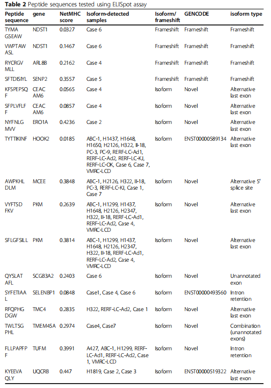 結(jié)果:對(duì)22組細(xì)胞系進(jìn)行全長(zhǎng)轉(zhuǎn)錄組測(cè)序,共鑒定出2021種新的剪接異構(gòu)體。其中一些異構(gòu)體的蛋白質(zhì)表達(dá)通過(guò)蛋白質(zhì)組分析進(jìn)行驗(yàn)證。無(wú)義介導(dǎo)的mRNA衰減因子(NMD)UPF1的降低和剪接因子SF3B1的減少增加了異常轉(zhuǎn)錄本的比例。NetMHC對(duì)每種HLA分子結(jié)合的親和力的評(píng)估顯示,一些亞型可能產(chǎn)生新抗原候選體,還在7個(gè)非小細(xì)胞肺癌標(biāo)本中發(fā)現(xiàn)了剪接亞型。酶聯(lián)免疫吸附斑點(diǎn)試驗(yàn)表明,大約一半的候選肽有可能通過(guò)與人類白細(xì)胞抗原分子的相互作用激活T細(xì)胞反應(yīng)。大約一半的多肽通過(guò)與HLA分子的相互作用具有激活T細(xì)胞反應(yīng)的潛力。最后,作者通過(guò)參考構(gòu)建的目錄來(lái)估計(jì)癌癥基因組圖譜(TCGA)數(shù)據(jù)庫(kù)中的亞型數(shù)量,發(fā)現(xiàn)NMD因子的破壞與TCGA-Lung Adenocarcinoma數(shù)據(jù)集中發(fā)現(xiàn)的剪接亞型數(shù)量顯著相關(guān)。