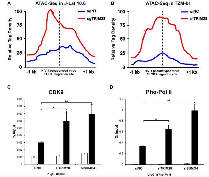 其中,作者通過(guò)ATAC-Seq探究了TRIM28缺失后HIV-1啟動(dòng)子的染色質(zhì)可及性,發(fā)現(xiàn)啟動(dòng)子區(qū)的活性顯著增強(qiáng),最終說(shuō)明了RIM28介導(dǎo)的SUMO化損害了CDK9與Cyclin T1的結(jié)合能力和CDK9對(duì)RNAP II的激酶活性,導(dǎo)致轉(zhuǎn)錄延伸功能障礙。