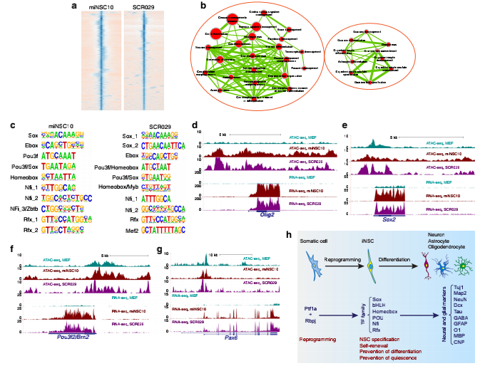 由體細(xì)胞重編程的誘導(dǎo)性神經(jīng)干細(xì)胞(induced neural stem cells,iNSC)在神經(jīng)疾病的細(xì)胞替代療法和體外建模中具有巨大的潛力。已有研究證明將成纖維細(xì)胞直接轉(zhuǎn)化成iNSC的方法依賴(lài)于幾個(gè)關(guān)鍵的神經(jīng)前體細(xì)胞轉(zhuǎn)錄因子(TF),這就提出了一個(gè)問(wèn)題:這種直接的重編程是否可以由非神經(jīng)前體細(xì)胞調(diào)控TF來(lái)實(shí)現(xiàn)。通過(guò)RNA-seq和ATAC-seq分析結(jié)果,作者發(fā)現(xiàn)非神經(jīng)前體細(xì)胞調(diào)控TFPtf1a可以將小鼠和人的成纖維細(xì)胞直接重編程為具有分化出神經(jīng)元、星形膠質(zhì)細(xì)胞和少突膠質(zhì)細(xì)胞的潛能和自我更新能力的iNSC,并在移植后可以改善阿爾茨海默病小鼠模型的認(rèn)知功能障礙。相比于MEF,miNSC10和SCR029細(xì)胞,Ptf1a重編程的miNSC自我更新和維持所需要的Notch信號(hào)通路相關(guān)基因均顯著上調(diào),并且這些位點(diǎn)也顯示出差異的ATAC-seq圖譜。說(shuō)明Ptf1a的重編程活性是通過(guò)與Rbpj結(jié)合的非Notch信號(hào)依賴(lài)途徑,來(lái)維持NSC特化、自我更新和體內(nèi)穩(wěn)態(tài)。同時(shí)作者的數(shù)據(jù)確定了這是一種用于研究和治療的更安全的非典型iNSC。