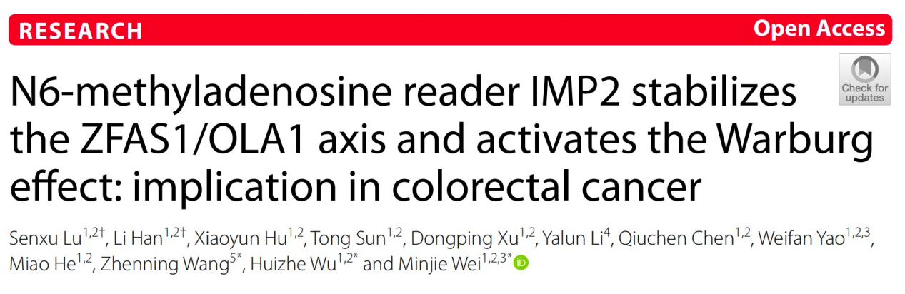 Lu S, Han L, Hu X, et al. N6-methyladenosine reader IMP2 stabilizes the ZFAS1/OLA1 axis and activates the Warburg effect: implication in colorectal cancer. J Hematol Oncol. 2021;14(1):188. Published 2021 Nov 7. doi:10.1186/s13045-021-01204-0