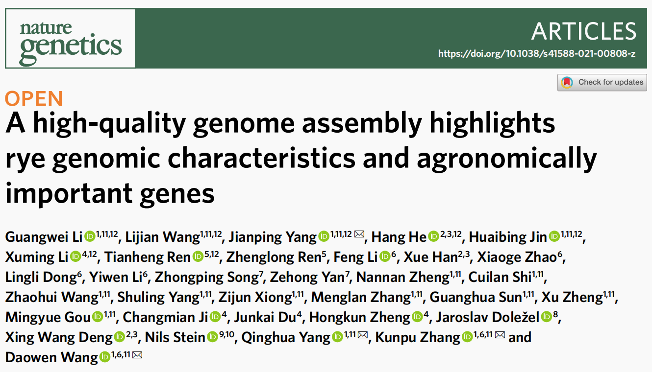 本研究對(duì)我國栽培的優(yōu)良品種威寧黑麥進(jìn)行了基因組測序,基因組組裝大小為7.74 Gb,其中93.67%被掛載到7條染色體上,重復(fù)序列占總基因組的90.31%。并基于高質(zhì)量基因組揭示了全基因組基因復(fù)制及其對(duì)淀粉生物合成基因的影響,解析了復(fù)雜儲(chǔ)存蛋白基因座位點(diǎn)、早抽穗性狀的基因表達(dá)特征以及黑麥中與馴化相關(guān)的染色體區(qū)域和基因座。本次研究結(jié)果對(duì)黑麥的基因組特性及其農(nóng)藝性狀調(diào)控基因有了新的認(rèn)識(shí),獲得了對(duì)進(jìn)一步研究黑麥馴化遺傳基礎(chǔ)可能有用的染色體區(qū)域和基因座。威寧黑麥基因組組裝對(duì)于破解黑麥基因組生物學(xué),深化比較谷類基因組學(xué)研究,加速黑麥及相關(guān)谷類作物的遺傳改良具有重要價(jià)值。