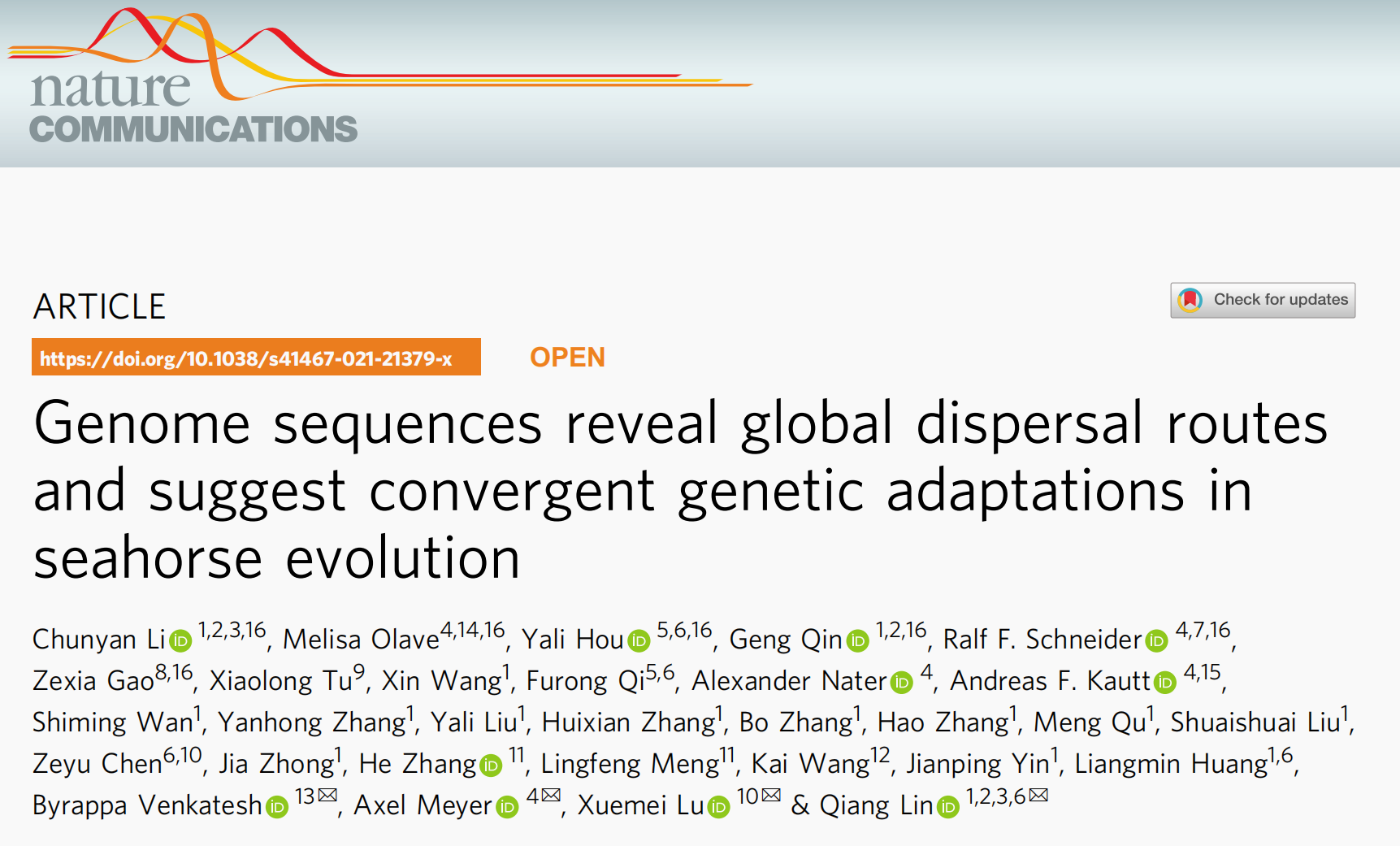 本研究利用PacBio和Hi-C技術(shù)重新組裝了雄性直立海馬的基因組,其組裝大小為420.66 Mb,contig N50=15.5Mb。并通過包含21個(gè)不同海馬種的358個(gè)海馬標(biāo)本重測序與進(jìn)化關(guān)系分析,研究了海馬在世界范圍內(nèi)的分布和生物地理格局。研究發(fā)現(xiàn)海馬在晚漸新世進(jìn)化,展示了其隨后的全球定居路線,并表示這種特征與洋流動(dòng)態(tài)變化和古時(shí)期的海道開口有關(guān)。此外,反復(fù)出現(xiàn)的“骨刺”適應(yīng)性表型的遺傳基礎(chǔ)與一個(gè)關(guān)鍵發(fā)育基因的獨(dú)立替代有關(guān)。因此,分析表明,通過洋流漂流可以彌補(bǔ)分散性差的缺陷,并且快速適應(yīng)有利于海馬開拓新的棲息地。