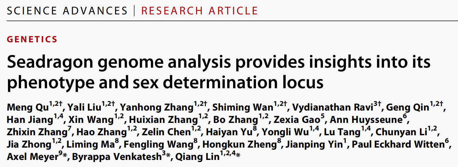 本研究完成雌雄性海龍基因組的破譯,草海龍最終組裝大小為 ~659 Mb(♂)與 ~663 Mb(♀), contig N50分別為10.0 Mb與12.1 Mb。綠海龍分別組裝~637 Mb(♂)與~648 Mb(♀),contig N50分別為18.0Mb與21.0 Mb。通過系統(tǒng)發(fā)育分析,明確草海龍與綠海龍?jiān)谙到y(tǒng)發(fā)育地位上屬于海龍亞科(Syngnathinae)的姊妹群,并于27.3 百萬年前左右發(fā)生分化。進(jìn)一步通過結(jié)合重測序分析、轉(zhuǎn)錄分析、比較基因組分析等研究揭示了草海龍適應(yīng)性進(jìn)化產(chǎn)物附葉的快速愈合和再生能力相關(guān)基因,以及海龍科物種性別決定基因的產(chǎn)生和演化歷程,為海洋魚類的環(huán)境適應(yīng)性進(jìn)化研究提供了重要理論依據(jù)。