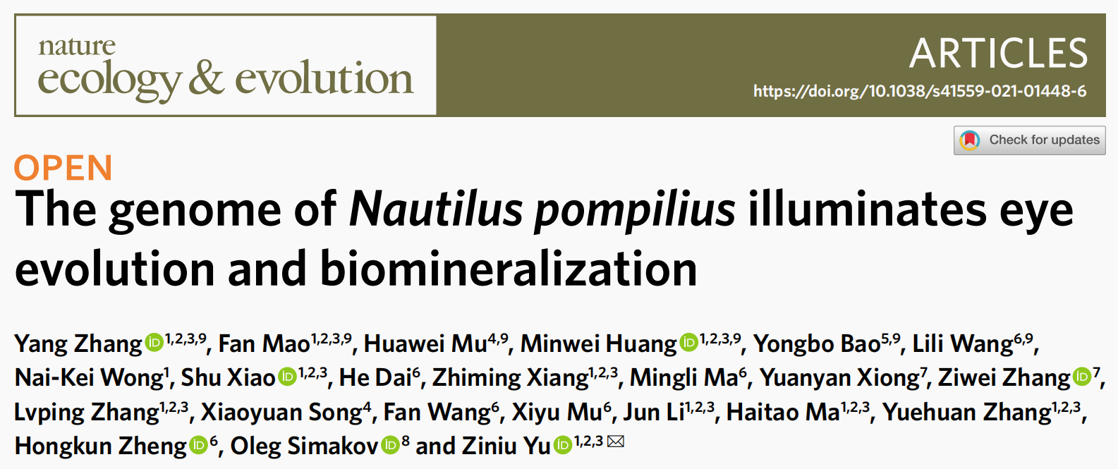 本研究基于PacBio平臺(tái)組裝了被測序的頭足類動(dòng)物中基因組*小的物種-鸚鵡螺基因組,其組裝大小為730.58 Mb,contigN50=1.1Mb,BUSCO評(píng)估為91.31%。通過鸚鵡螺基因組測序和進(jìn)化分析,揭示了針孔眼形成和生物礦化的演變規(guī)律,并結(jié)合轉(zhuǎn)錄組、蛋白組、基因家族及系統(tǒng)發(fā)育等分析對(duì)針孔眼、殼形成機(jī)制進(jìn)行了深入剖析。研究表明Hox簇完整性的破壞可能與軟體動(dòng)物譜系中外殼的進(jìn)化丟失有關(guān)。鸚鵡螺基因組中晶狀體發(fā)育的關(guān)鍵轉(zhuǎn)錄因子NRL/Maf的缺失和晶狀體形成蛋白的基因家族收縮,共同促進(jìn)了鸚鵡螺針孔眼的形成。相關(guān)的研究成果對(duì)鸚鵡螺的生物學(xué)研究、遺傳資源保護(hù)以及頭足動(dòng)物的適應(yīng)性演化都將發(fā)揮重要的推動(dòng)作用。