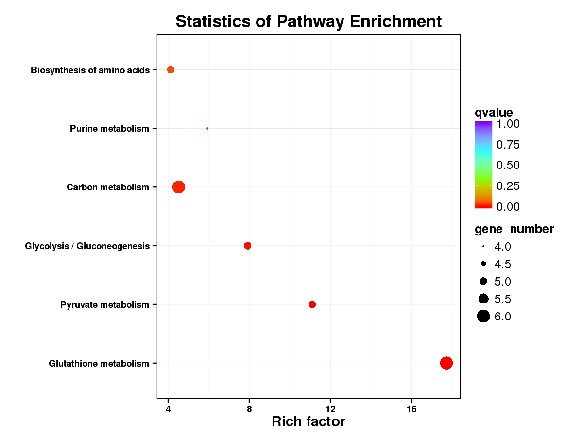 Pathway顯著性富集分析方法同GO功能富集分析,應(yīng)用超幾何檢驗(yàn),對(duì)于每個(gè)差異分組的4種變化趨勢(shì)中的基因和蛋白分別進(jìn)行KEGG富集,找出與所有鑒定到蛋白背景相比,在差異蛋白中顯著性富集的Pathway。通過(guò)Pathway顯著性富集能進(jìn)一步篩選出差異蛋白最主要參與的生化代謝途徑和信號(hào)轉(zhuǎn)導(dǎo)途徑。
