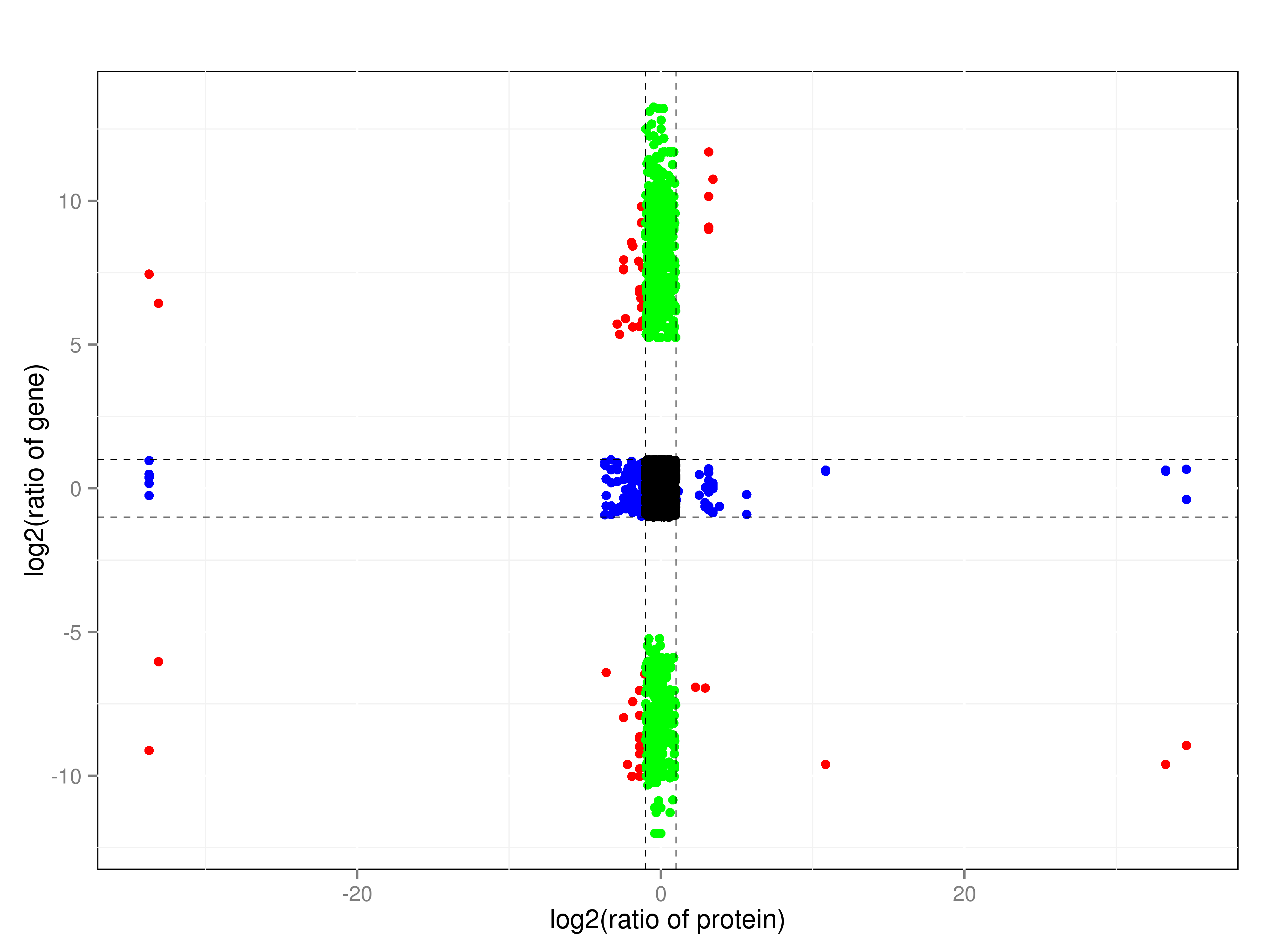 九象限圖是對(duì)數(shù)據(jù)進(jìn)行分類分析的常見(jiàn)方法。一般是利用水平和垂直分割線將圖表區(qū)域分為九個(gè)象限,每個(gè)象限的數(shù)據(jù)表現(xiàn)有所不同,而圖表主要以散點(diǎn)圖為主。對(duì)于每一對(duì)關(guān)聯(lián)的基因和蛋白,以其中蛋白的log2FC作為橫坐標(biāo),基因的log2FC作為縱坐標(biāo),得到所有差異分組的蛋白和轉(zhuǎn)錄組表達(dá)模式九象限圖,進(jìn)一步把基因和蛋白的表達(dá)劃分為更詳細(xì)變化趨勢(shì),有助于篩選符合研究預(yù)期的基因和蛋白集合。