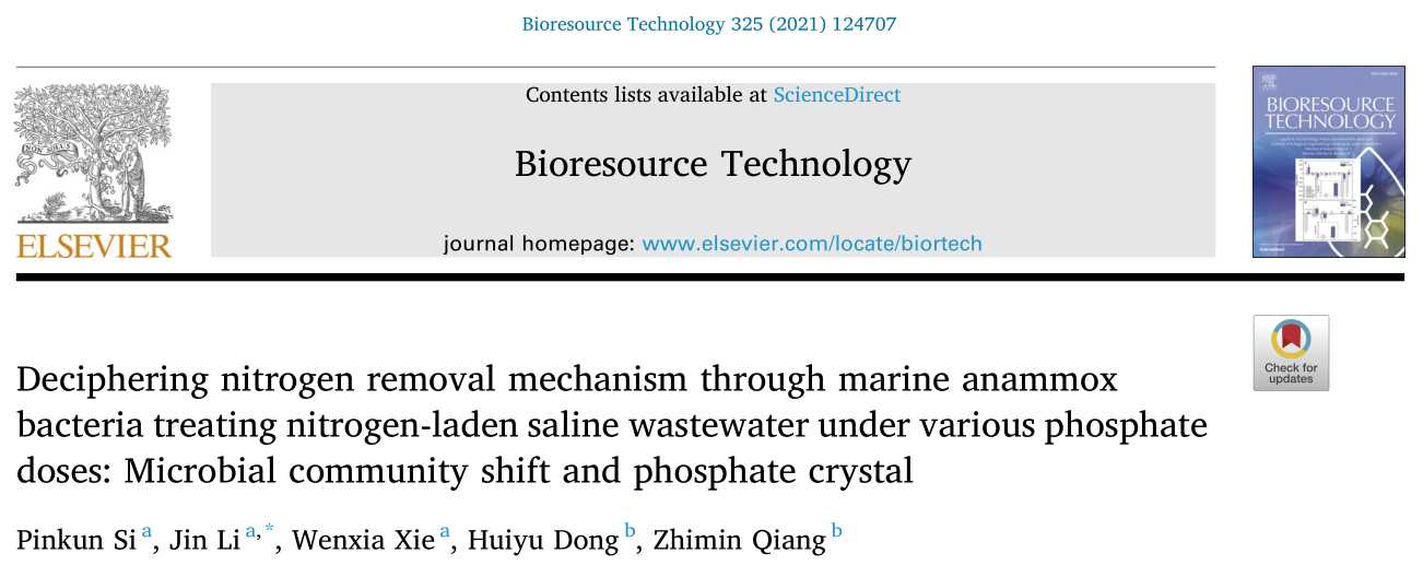 1.Si P, Li J, Xie W, et al. Deciphering nitrogen removal mechanism through marine anammox bacteria treating nitrogen-laden saline wastewater under various phosphate doses: Microbial community shift and phosphate crystal[J]. Bioresource Technology, 2021, 325: 124707.