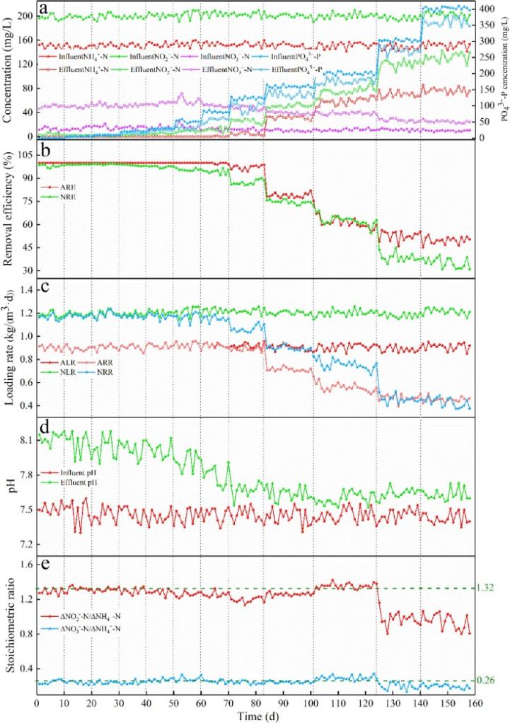 圖2. 不同磷酸鹽劑量下MAB在158 d內(nèi)的脫氮性能:(a)底物濃度;(b)去除效率;(c)裝載率;(d) pH值變化;(e)化學(xué)計(jì)量比